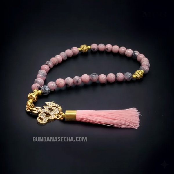 Tasbih ini terbuat dari 33 butir batu asli berwarna pink yang indah dan elegan, dipilih khusus karena vibrasinya yang melambangkan kelembutan, cinta kasih, dan keanggunan wanita.